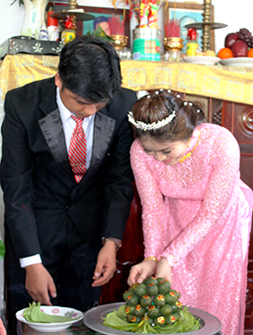 | Đôi tân hôn mở mâm trầu và lấy trầu cau mời hai họ - nghi thức quan trọng trong lễ cưới của người Việt. Ảnh: DUY KHÔI |