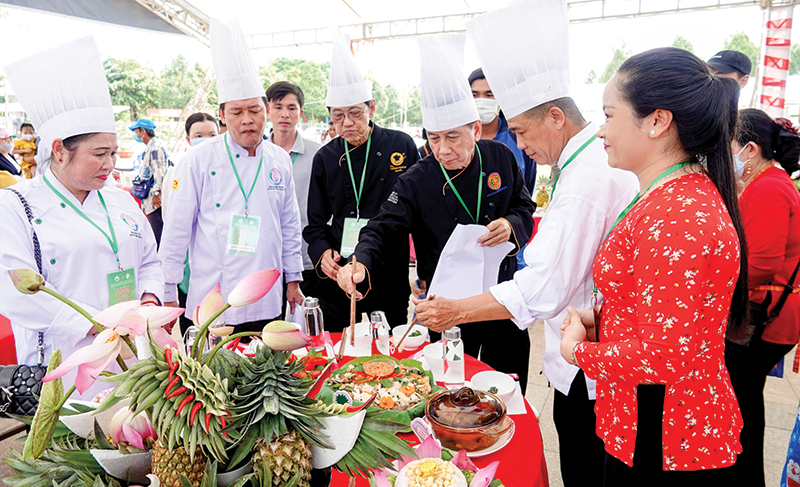Bà Nguyễn Thị Lý (bìa trái) cùng các chuyên gia ẩm thực tại Hội thi ẩm thực “Hương sắc Hậu Giang”, trình diễn 200 món ăn chế biến từ khóm Cầu Đúc và cá thát lát, nhằm quảng bá du lịch Hậu Giang.