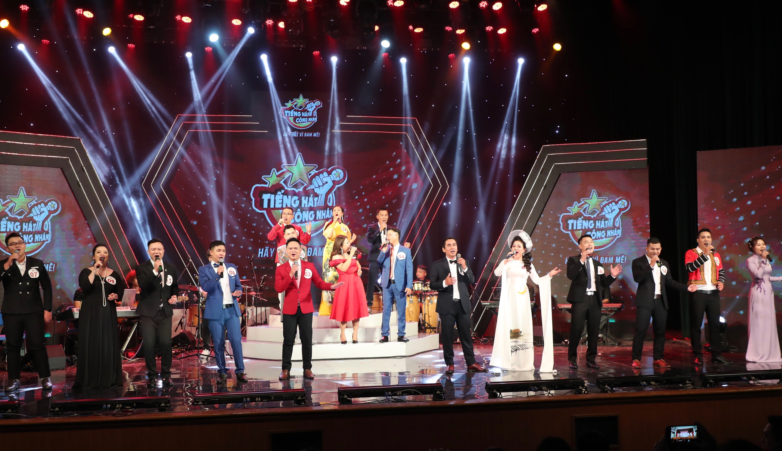 | Các thí sinh hòa giọng trong tiết mục mở màn đêm Chung kết |