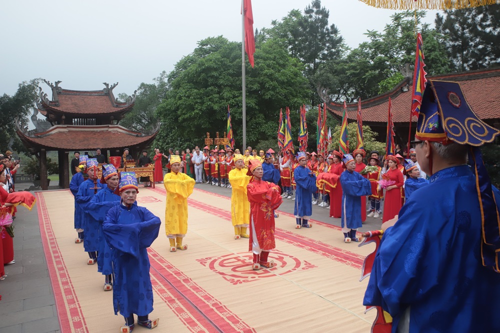 | Đội tế xã Chu Hóa (thành phố Việt Trì) thực hiện lễ tế Đức Quốc Tổ Lạc Long Quân theo lễ nghi truyền thống. |