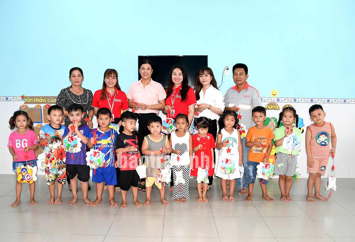Đại diện Chi nhánh Công trình Viettel Trà Vinh và lãnh đạo Trường Mẫu giáo Long Thới trao lồng đèn cho học sinh.