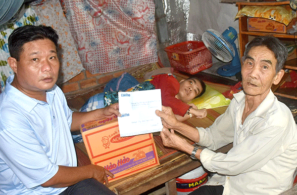 Cán bộ Ban công tác mặt trận khu vực 2, phường An Khánh, quận Ninh Kiều (bên trái) trao tiền của bạn đọc Báo Cần Thơ gởi giúp gia đình ông Trần Minh Hải.
