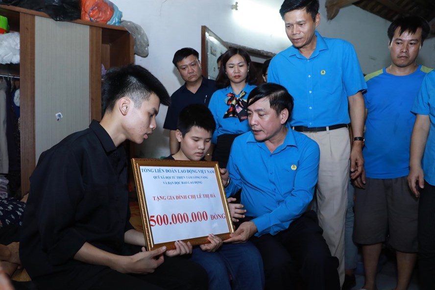 Trao tượng trưng số tiền 500 triệu đồng cho hai con trai chị Hà, Chủ tịch Tổng LĐLĐ Việt Nam Bùi Văn Cường mong muốn hai cháu sớm vượt qua nỗi đau, ổn định cuộc sống, nhất là Đức Anh (con trai lớn của chị) tập trung cho việc học để có kết quả tốt nhất trong kỳ thi vào lớp 10 sắp tới.