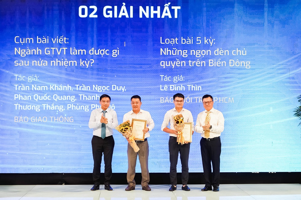 | Bộ trưởng Bộ GTVT Nguyễn Văn Thắng và đồng chí Lê Quốc Minh, Tổng Biên tập Báo Nhân dân, Phó trưởng Ban Tuyên giáo Trung ương trao giải Nhất cho đại diện 2 nhóm tác giả. (Ảnh: KC) |