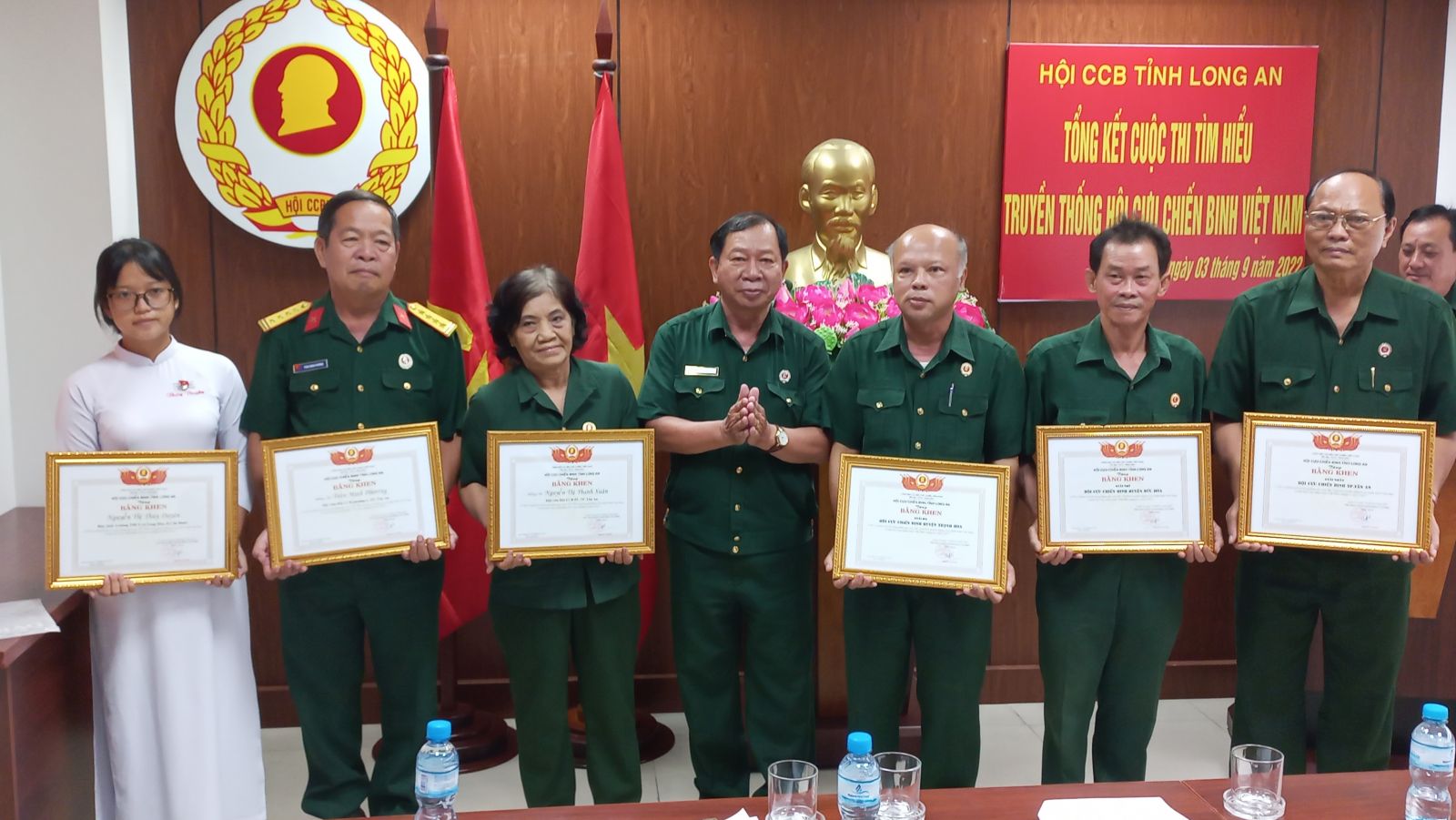 Ban Tổ chức đã trao giải nhất tập thể cho Hội CCB TP.Tân An, giải nhì cho Hội CCB huyện Đức Hòa và giải ba cho Hội CCB huyện Thạnh Hóa; giải nhất cá nhân cho Nguyễn Thị Thanh Xuân, hội viên Hội CCB phường 2, TP.Tân An; giải nhì cho Trần Minh Phương, hội viên Hội CCB phường 6, TP.Tân An và giải ba cho Nguyễn Thị Thùy Duyên, học sinh Trường THPT Rạch Kiến, huyện Cần Đước.