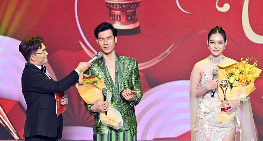 | Diễn viên Nhan Phúc Vinh và Diệp Bảo Ngọc nhận giải thưởng hạng mục “Nam, nữ diễn viên điện ảnh - truyền hình được yêu thích nhất” (Ảnh: Quốc Thanh) |