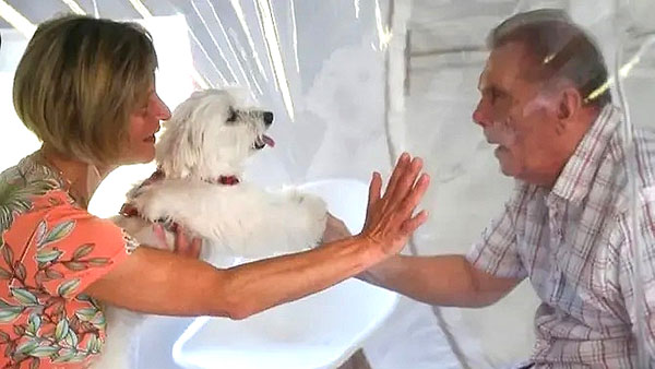 Tuy vậy, đây không phải là một cuộc gặp gỡ bình thường, bởi hai vợ chồng phải trò chuyện trong một chiếc lều bong bóng, ở giữa có ngăn một tấm vách nhựa trong suốt, để đảm bảo họ vừa được “mặt đối mặt” vừa tránh được nguy cơ nhiễm COVID-19.
