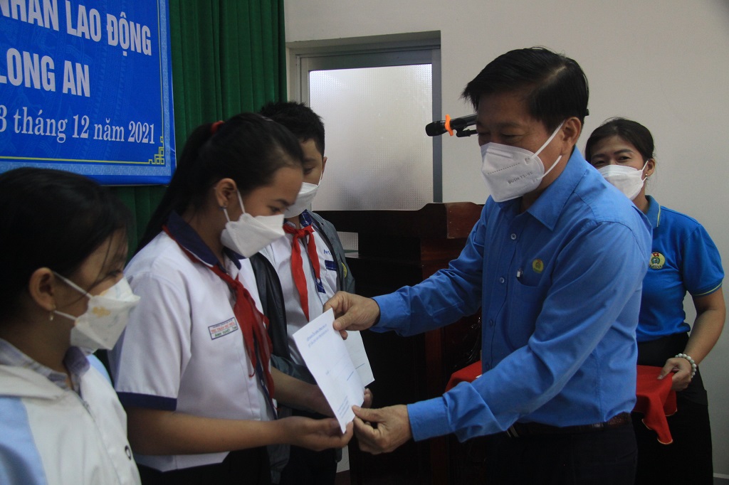 Chủ tịch Liên đoàn Lao động tỉnh – Nguyễn Văn Quí chia sẻ khó khăn với học sinh được nhận học bổng và gửi lời chúc các cháu nỗ lực vượt qua khó khăn, cố gắng học tập để trở thành con ngoan trò giỏi.