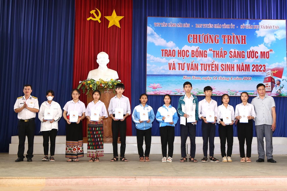 Dịp này, 10 em học sinh có hoàn cảnh khó khăn, nỗ lực vươn lên trong học tập đã được Tổng Công ty Tân Cảng Sài Gòn trao học bổng “Thắp sáng ước mơ”, mỗi suất trị giá 2 triệu đồng; tặng sách cho thư viện trường THPT dân tộc nội trú tỉnh Kon Tum.