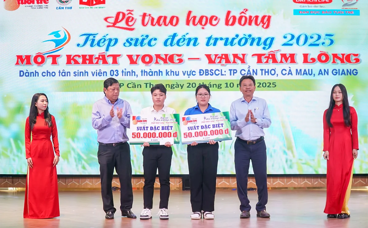 (CTO) - Chiều 20-10, Báo Tuổi Trẻ phối hợp với Thành đoàn Cần Thơ và Trường Đại học Nam Cần Thơ tổ chức Lễ trao học bổng “Tiếp sức đến trường” năm 2025, với chủ đề “Một khát vọng – Vạn tấm lòng”.