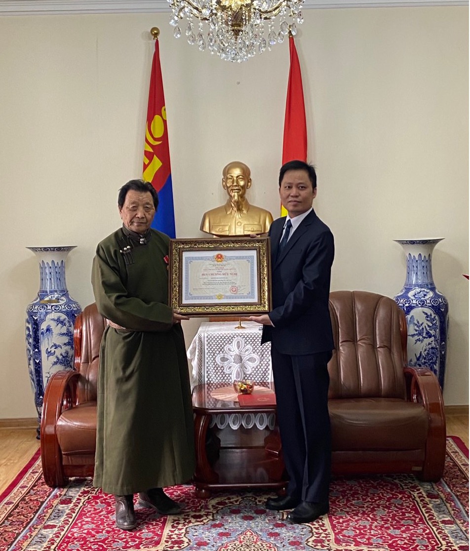 Ngày 17/3, Đại sứ quán Việt Nam tại Mông Cổ tổ chức Lễ trao tặng Huy chương Hữu nghị của Chủ tịch nước CHXHCN Việt Nam cho Giáo sư, Tiến sĩ S.Dashtsevel, Chủ tịch Hội Hữu nghị Mông Cổ - Việt Nam.