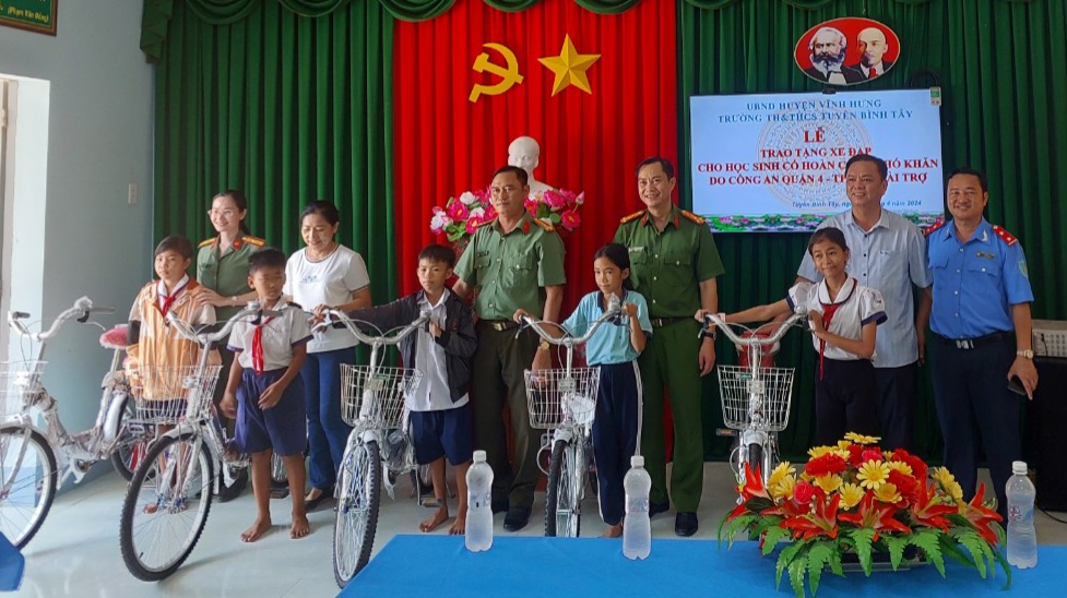 Công an quận 4, TP.HCM đến huyện Vĩnh Hưng trao tiền hỗ trợ sửa chữa nhà ở cho gia đình khó khăn và trao tặng xe đạp cho học sinh nghèo vượt khó học giỏi.