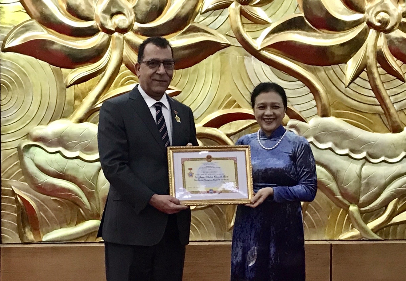 Thay mặt Đoàn Chủ tịch Liên hiệp các tổ chức hữu nghị Việt Nam, Chủ tịch Nguyễn Phương Nga trao Kỷ niệm chương “Vì hòa bình, hữu nghị giữa các dân tộc” tặng Đại sứ Jaime Chomali. Đây là phần thưởng cao quý nhất của Liên hiệp các tổ chức hữu nghị Việt Nam nhằm ghi nhận và tôn vinh những đóng góp quý báu của Đại sứ trong việc củng cố và tăng cường mối quan hệ hữu nghị và hợp tác toàn diện giữa nhân dân hai nước Việt Nam và Chile.