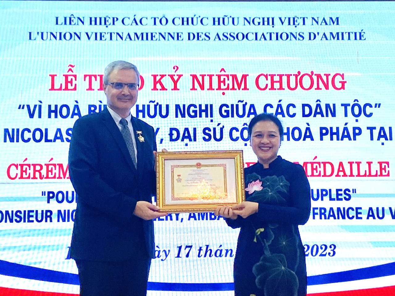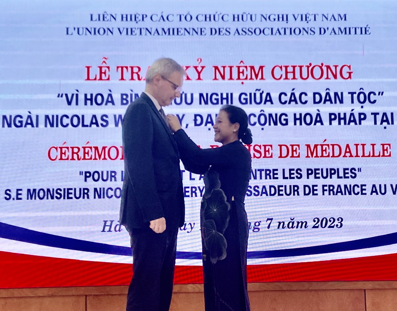 | Chủ tịch VUFO Nguyễn Phương Nga trao Kỷ niệm chương “Vì hòa bình, hữu nghị giữa các dân tộc” tặng Đại sứ Đặc mệnh toàn quyền Cộng hòa Pháp tại Việt Nam Nicolas Warnery. |