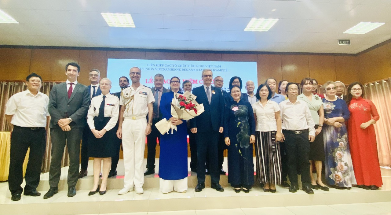 | Chủ tịch VUFO Nguyễn Phương Nga và Đại sứ Đặc mệnh toàn quyền Cộng hòa Pháp tại Việt Nam Nicolas Warnery chụp ảnh lưu niệm cùng các đại biểu. |