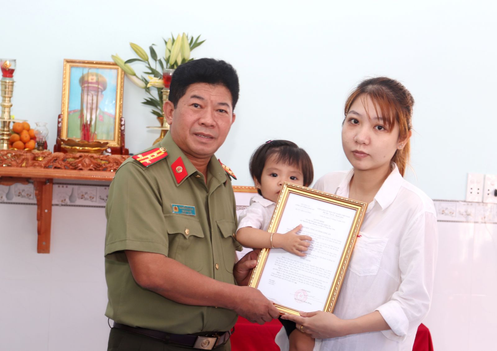 Đại tá Nguyễn Văn Hòa - Phó Giám đốc Công an tỉnh Long An, lãnh đạo huyện Cần Đước đến dự và trao nhà. Căn nhà có diện tích 70m2, kinh phí xây dựng 100 triệu đồng từ quỹ nghĩa tình đồng đội Công an nhân dân - Bộ Công an.