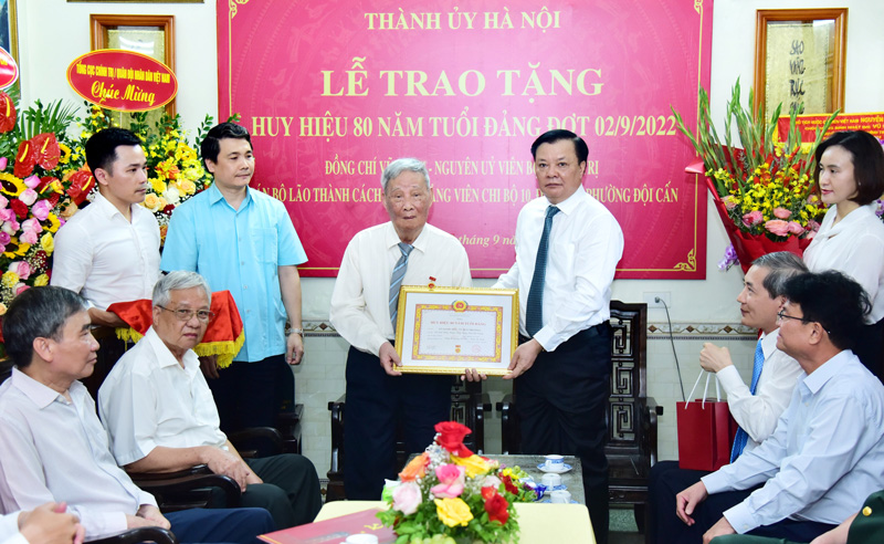 Trân trọng gắn Huy hiệu 80 năm tuổi Đảng và tặng hoa đồng chí Vũ Oanh, Bí thư Thành ủy Hà Nội Đinh Tiến Dũng chúc đồng chí dồi dào sức khỏe, trường thọ.