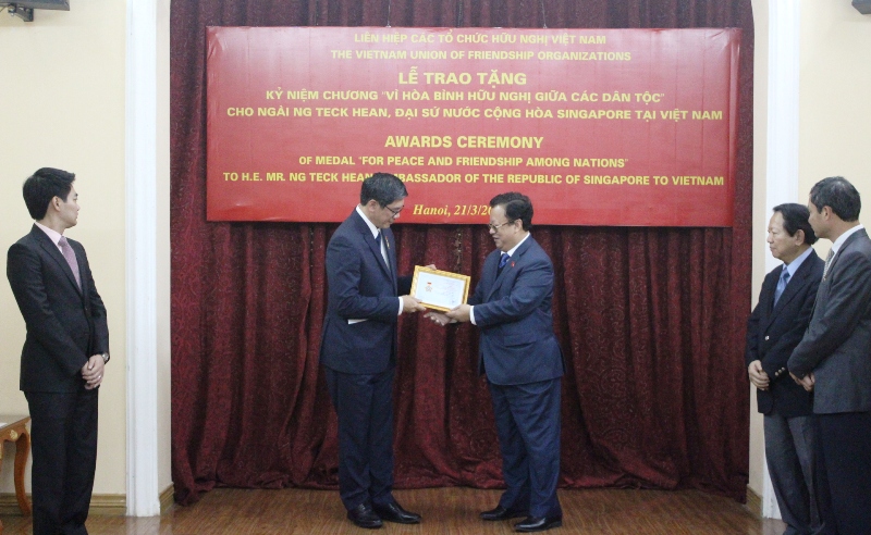 Thay mặt Đoàn Chủ tịch Liên hiệp các tổ chức hữu nghị Việt Nam, Chủ tịch Vũ Xuân Hồng trao tặng Kỷ niệm chương “Vì hòa bình hữu nghị giữa các dân tộc” cho Đại sứ đặc mệnh toàn quyền nước Cộng hòa Singapore tại Việt Nam Ng Teck Hean. Phần thưởng này nhằm ghi nhận và tôn vinh những đóng góp tích cực của Đại sứ Ng Teck Hean trong việc thúc đẩy quan hệ hợp tác hữu nghị giữa hai nước Việt Nam và Singapore trong nhiệm kỳ công tác tại Việt Nam.