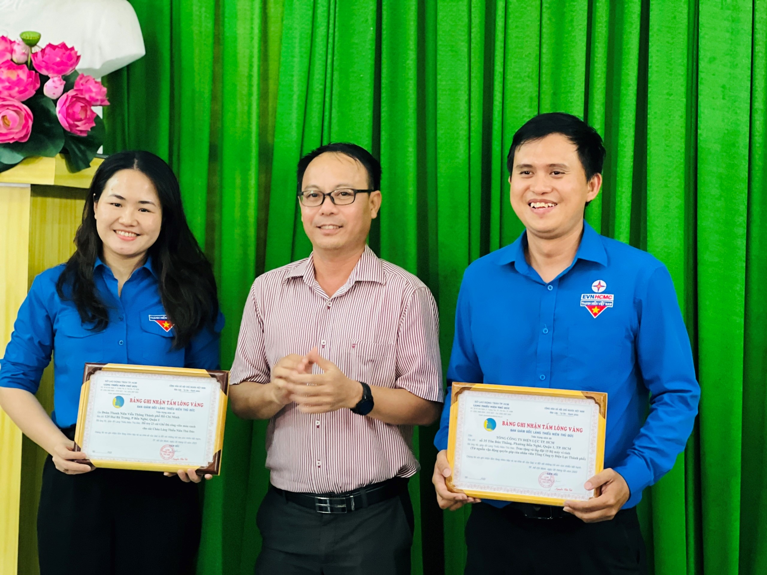 | Đồng chí Huỳnh Tấn Khương – Bí thư Đoàn Thanh niên EVNHCMC (áo xanh bên phải ảnh) đại diện EVNHCMC nhận Bảng ghi nhận tấm lòng vàng từ đồng chí Nguyễn Hữu Tài – Giám đốc Làng thiếu niên Thủ Đức (đứng giữa). |