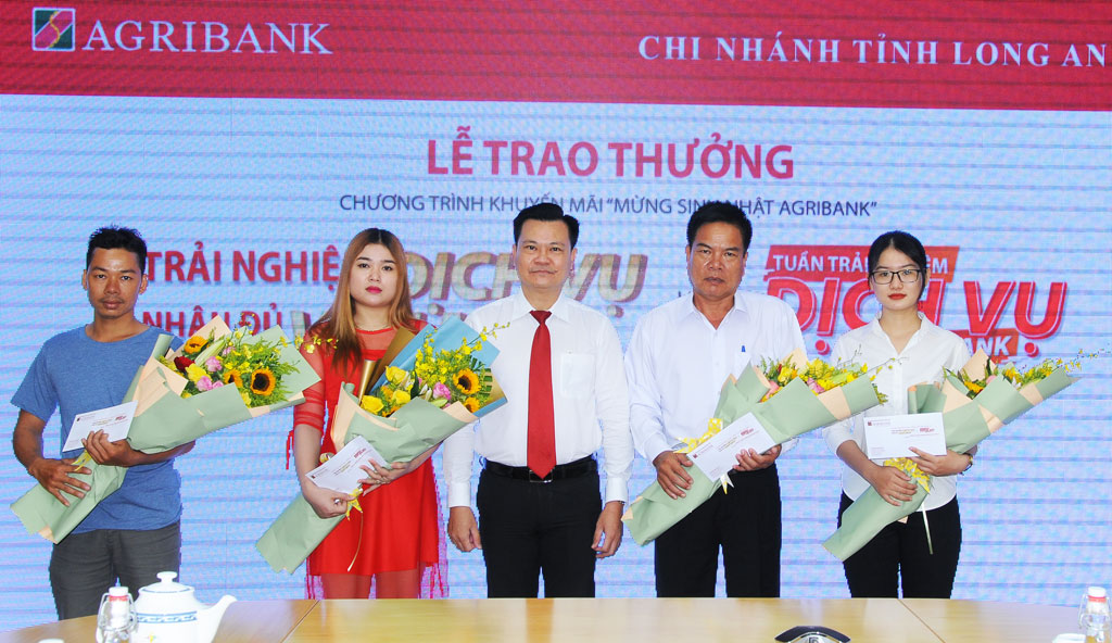 Phó Giám đốc Agribank Chi nhánh tỉnh Long An - Nguyễn Trí Dũng trao giải khuyến khích cho các khách hàng trúng thưởng