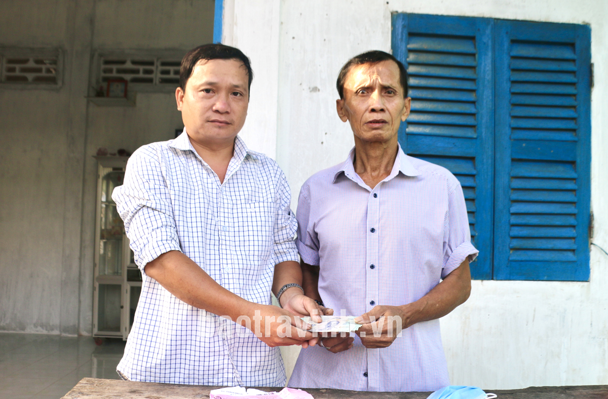 Đồng chí Nguyễn Văn Chiến (bên trái), Bí thư Chi bộ ấp Kinh A, trao tiền hỗ trợ của mạnh thường quân cho ông Đường Văn Cón.