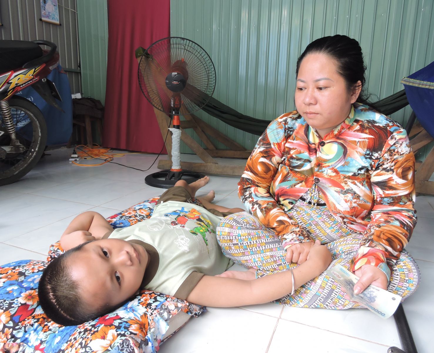 Em Toàn đã phẫu thuật ráp hộp sọ nhưng vẫn nằm liệt một chỗ, tay chân co cứng, mắt không nhìn thấy được. Hằng ngày, mẹ kề cận chăm sóc Toàn, không đi làm được, trong khi gia cảnh nghèo khó nên đời sống rất khó khăn.