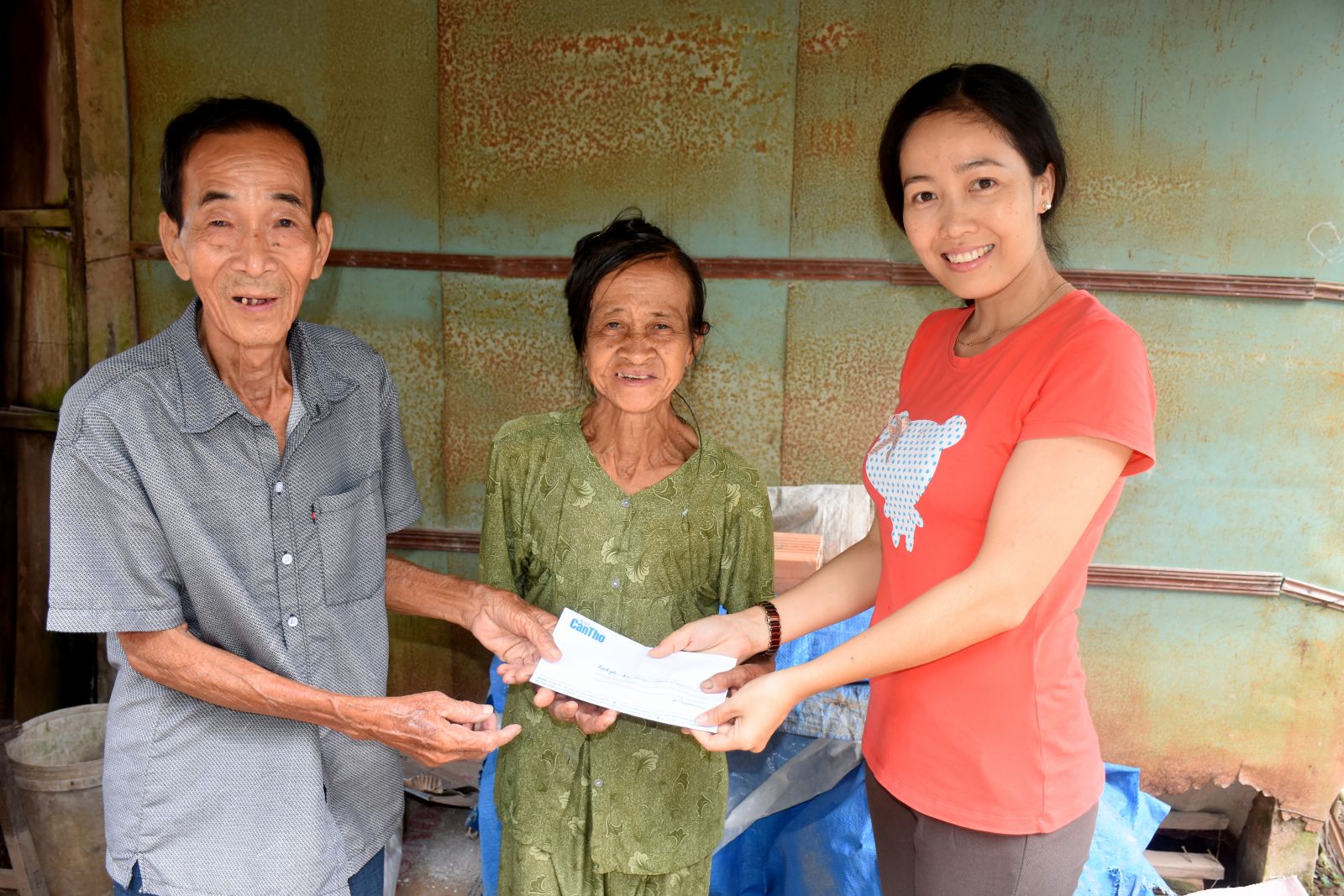 Đại diện Báo Cần Thơ trao tiền của bạn đọc gởi giúp gia đình ông Thái Tích Súng. Ảnh: X.Đào