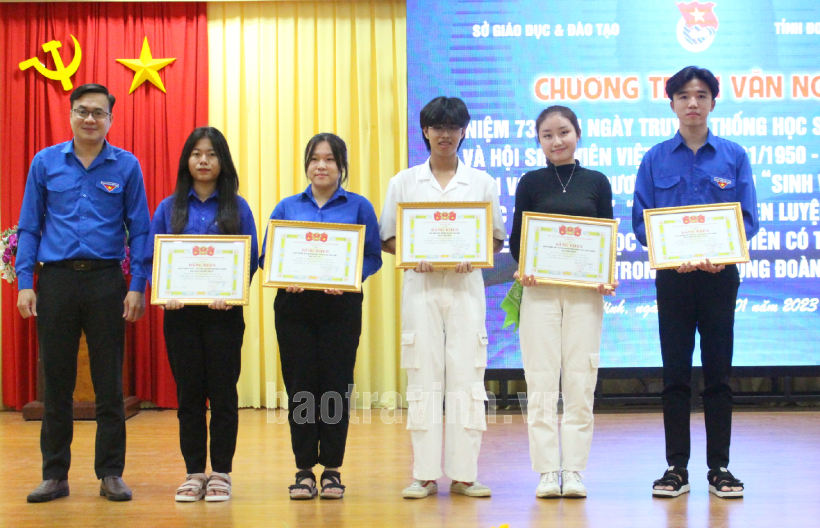 Anh Nguyễn Thanh Nhã, Phó Bí thư Tỉnh Đoàn trao giải cho các nhóm nhảy đạt thành tích cao tại chương trình văn nghệ kỷ niệm 73 năm ngày truyền thống học sinh, sinh viên và Hội Sinh viên Việt Nam.