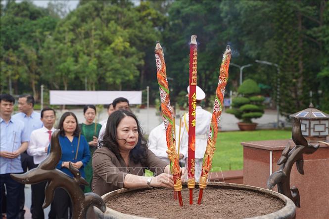 | Phó Chủ tịch nước Võ Thị Ánh Xuân dâng hương tại Nghĩa trang Hàng Dương. (Ảnh: TTXVN) |