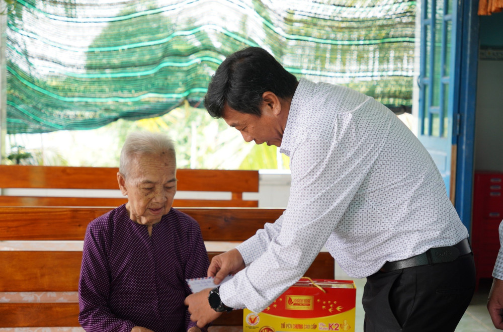 Hàng năm, huyện Tân Trụ đều dành nguồn lực để kịp thời thăm hỏi, tặng quà cho người có công với cách mạng (Trong ảnh: Phó Bí thư Thường trực, Chủ tịch HĐND huyện Tân Trụ - Tô Văn Cư thăm, tặng quà cho Mẹ Việt Nam Anh hùng Trần Thị Ngà)
