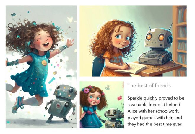 NXB Tor Books của Mỹ đã sử dụng AI để vẽ bìa cuốn sách mới "Fractal Noise" của Christopher Paolini. Còn tác giả Ammaar Reshi (Mỹ) cũng trở thành tâm điểm chú ý khi dùng AI để sáng tác truyện thiếu nhi chỉ trong vòng vài ngày. Ammaar Reshi đã lấy dữ liệu trò chuyện của anh với ChatGPT về một cô gái trẻ tên Alice, sau đó chuyển văn bản này sang dạng hình ảnh thông qua công cụ AI Midjourney (vừa mới ra mắt) để tạo nên tác phẩm "Alice and Sparkle". Ammaar Reshi nói: "Những công cụ này dễ tiếp cận và không khó sử dụng". Bất ngờ là "Alice and Sparkle" (ảnh) được độc giả đón nhận. Cuốn sách được bán trên Amazon và trở thành chủ đề được đề cập nhiều trên Twitter.