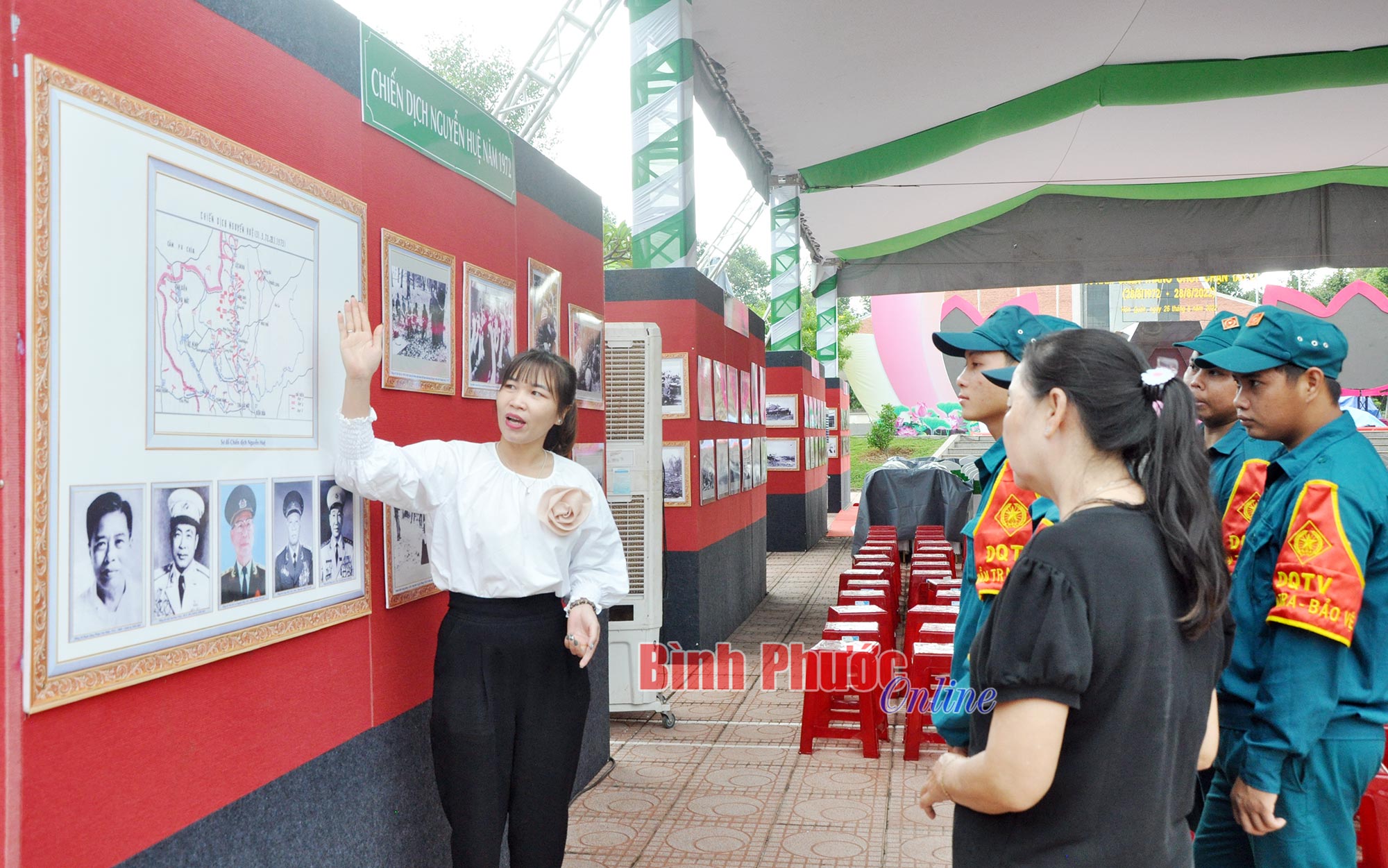 | Người dân và thế hệ trẻ huyện Hớn Quản tìm hiểu về những chiến công vang dội trong chiến dịch Nguyễn Huệ năm 1972 qua các hình ảnh trưng bày tại triển lãm. (Ảnh: Báo Bình Phước) |