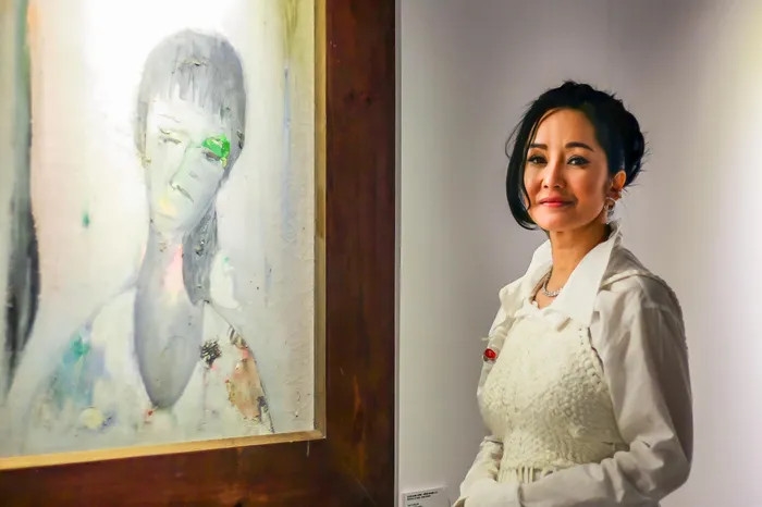 | Ca sĩ Hồng Nhung cùng bức chân dung của chính mình được vẽ bởi nhạc sĩ Trịnh Công Sơn (Ảnh: TL) |