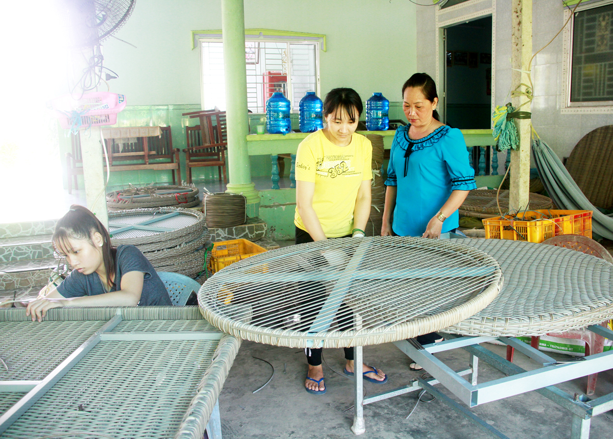 Chị Nguyễn Thị Bích Lệ, Tổ trưởng tổ hợp tác, cho biết: “Gia đình có người thân làm việc tại Công ty cổ phần Thương mại xuất nhập khẩu Thiên Minh nên tôi theo học nghề và mang hàng về cho chị em gia công. Tôi tự học hỏi cách đan nhanh, đẹp và khéo để hướng dẫn các hội viên. Công ty cũng cử người hướng dẫn các thành viên đan mẫu bàn, ghế mới”. Hiện nay, trung bình mỗi tuần, chị Lệ nhận từ 2 – 3 đợt hàng, mỗi đợt khoảng 150 bộ (gồm: bàn, ghế, chân ghế,…), phân phối cho thành viên trong tổ; đồng thời, bố trí 4 điểm bắn khung, làm sườn. Qua đó, tổ hợp tác tạo việc làm thường xuyên cho trên 100 người dân ấp 3, ấp 1, ấp 6 của xã và một số người các xã lân cận với thu nhập ổn định từ 2 triệu đồng đến 4 triệu đồng/người/tháng.