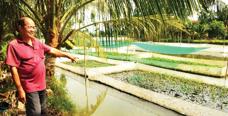 Mô hình nuôi ếch kết hợp cá tra của hộ ông Hà Văn Hồi, Tổ trưởng Tổ chăn nuôi ếch xã Vĩnh Trinh.