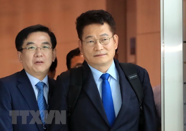 Ông Song Young-gil (phải), Chủ tịch Ủy ban hợp tác kinh tế miền Bắc thuộc Phủ tổng thống Hàn Quốc, dẫn đầu phái đoàn công tác chuẩn bị rời sân bay Incheon để tới khu vực kinh tế đặc biệt Rason ngày 12/7. (Ảnh: Yonhap/TTXVN)