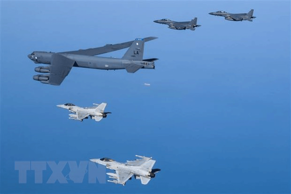 Máy bay ném bom chiến lược B-52H (giữa) của Mỹ cùng máy bay chiến đấu F-15K và KF-16 của Hàn Quốc tham gia cuộc tập trận ngày 6/3/2023. (Ảnh: Yonhap/TTXVN)