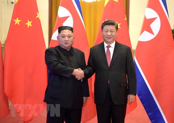 Chủ tịch Trung Quốc Tập Cận Bình (phải) trong cuộc gặp nhà lãnh đạo Triều Tiên Kim Jong-un tại Bắc Kinh ngày 8/01/2019. (Nguồn: THX/TTXVN)