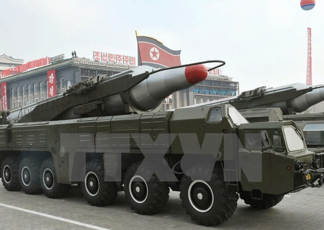 Tên lửa Musudan tham gia lễ duyệt binh ở Bình Nhưỡng. (Nguồn: Kyodo/TTXVN)