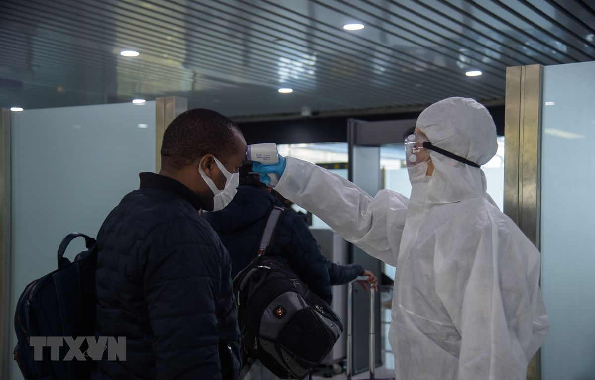 Nhân viên y tế kiểm tra thân nhiệt cho hành khách tại sân bay quốc tế Bình Nhưỡng, Triều Tiên ngày 9/3/2020. (Ảnh: AFP/ TTXVN)