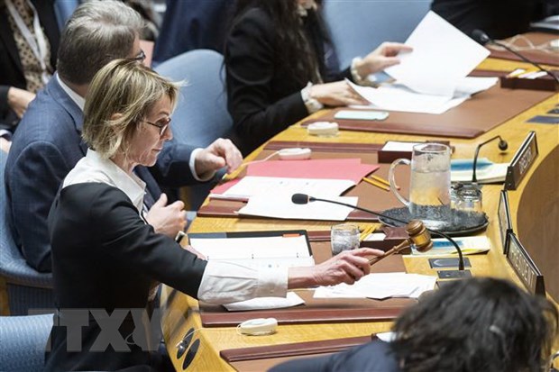 Đại sứ Mỹ tại Liên hợp quốc Kelly Craft (thứ nhất, trái) chủ trì phiên họp của Hội đồng Bảo an Liên hợp quốc tại New York, ngày 11/12/2019. (Nguồn: AFP/TTXVN)