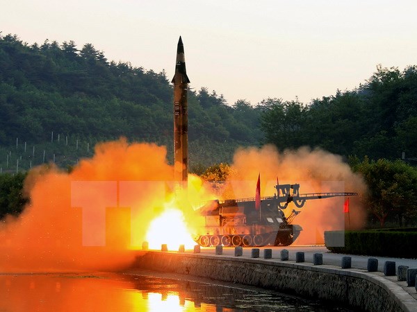 Triều Tiên phóng thử một tên lửa đạn đạo được trang bị hệ thống dẫn đường chính xác tại một địa điểm bí mật ở Triều Tiên. (Ảnh: EPA/ TTXVN)