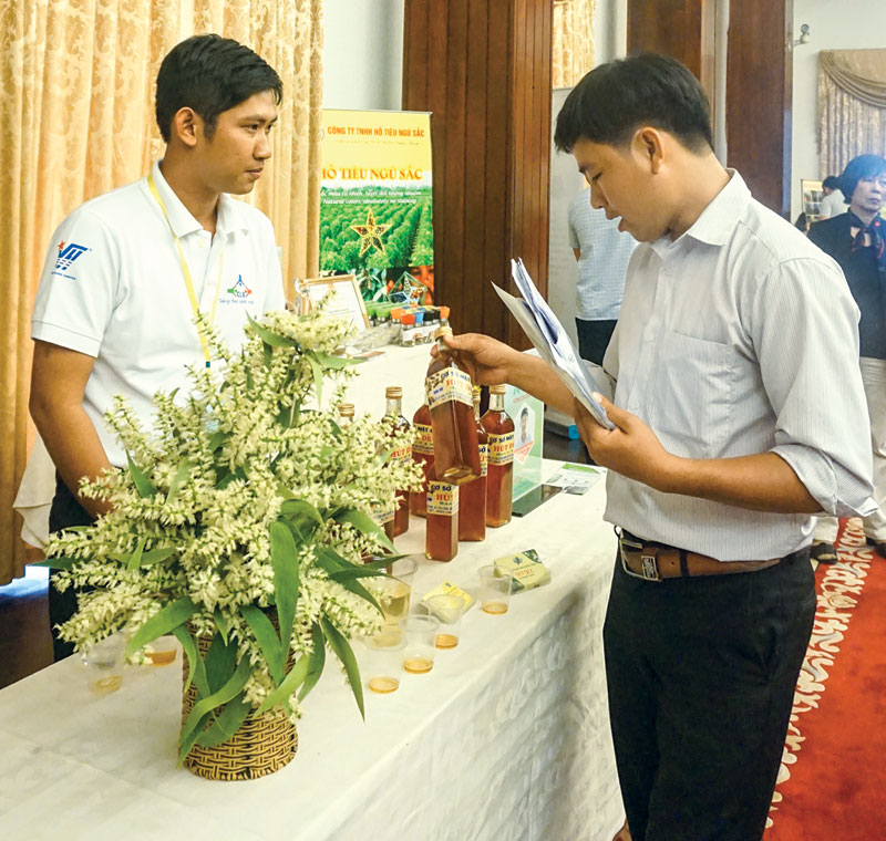 Anh Trần Thành Long (bìa trái) giới thiệu sản phẩm mật ong Hương Tràm tại Cuộc thi “Dự án khởi nghiệp Nông nghiệp” lần 3 năm 2017 do Trung tâm Nghiên cứu kinh doanh và Hỗ trợ doanh nghiệp (BSA) phối hợp cùng các đơn vị, doanh nghiệp tổ chức.