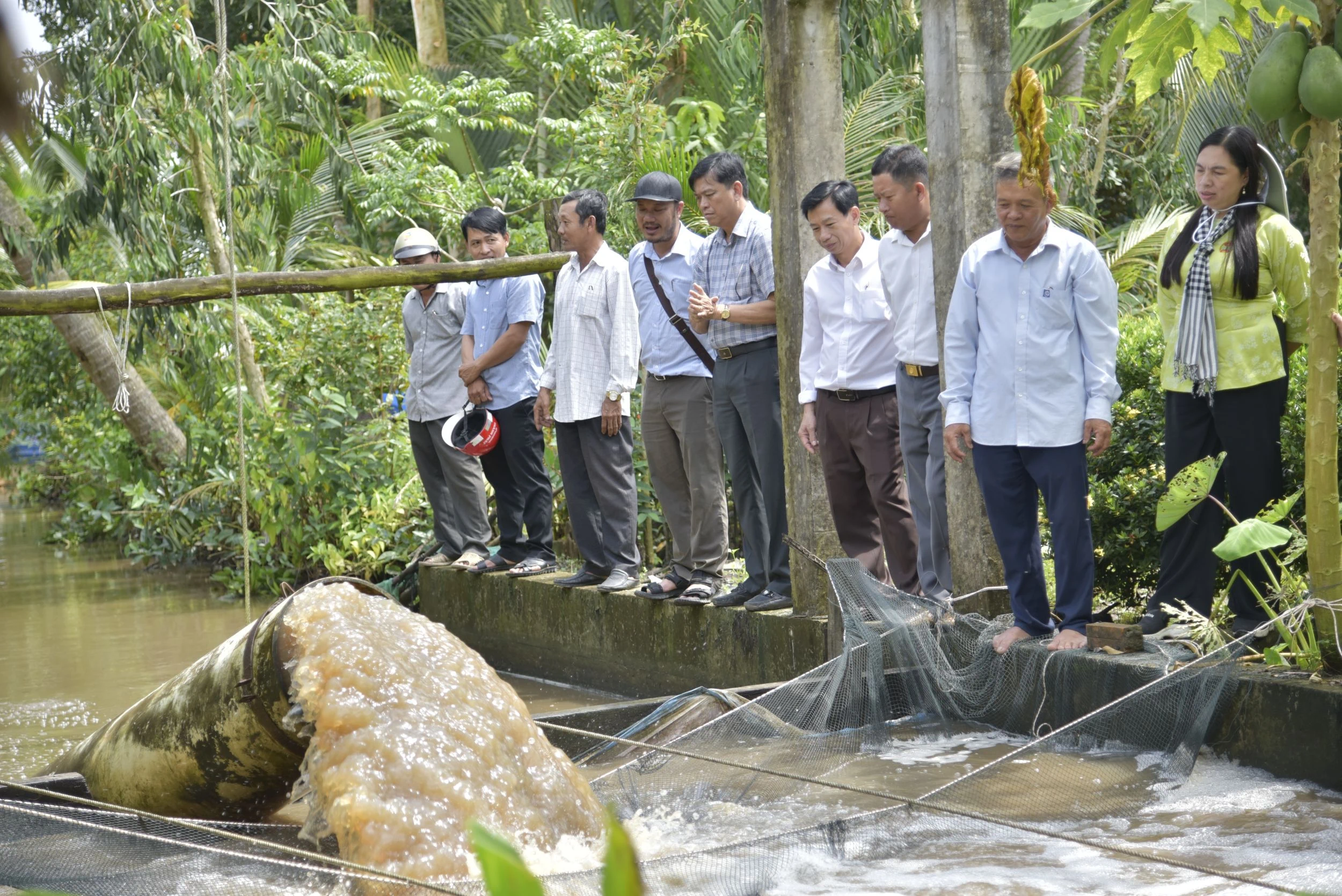 Đoàn công tác của Hội Nông dân tỉnh và Sở Nông nghiệp và Phát triển nông thôn Kiên Giang tham quan trạm bơm điện tại Hợp tác xã nông nghiệp Đường Gỗ Lộ.