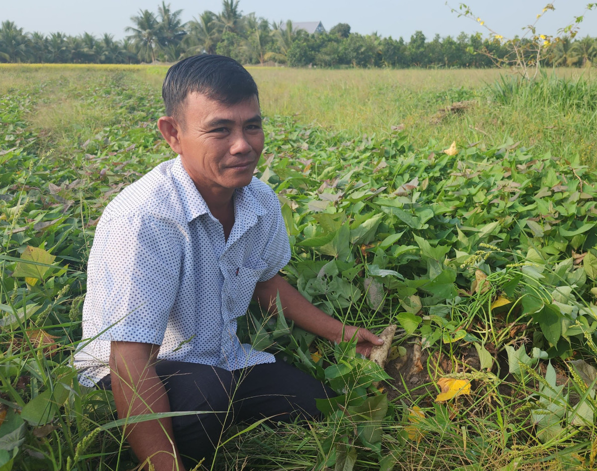Gia đình ông Trần Trung Tâm (ấp Ông Nhan Đông, xã Bình Hiệp, thị xã Kiến Tường) canh tác khoảng 2ha giống khoai lang trắng. Theo ông Tâm, khoai lang chịu được khô hạn, chỉ cần tưới từ 3-4 lần/vụ nên ít tốn công chăm sóc, chi phí phân bón cũng ít hơn so với trồng lúa. Trồng khoai lang chỉ sử dụng các loại phân chuồng hoai mục, không sử dụng các loại thuốc bảo vệ thực vật. Thời gian từ khi trồng đến thu hoạch từ 3-3,5 tháng. Năng suất trung bình khoảng 20 tấn/ha. Giá bán hiện tại từ 8.000-10.000 đồng/kg. Sau khi trừ chi phí, nông dân có thu nhập từ 110-140 triệu đồng/ha, cao hơn so với trồng lúa.