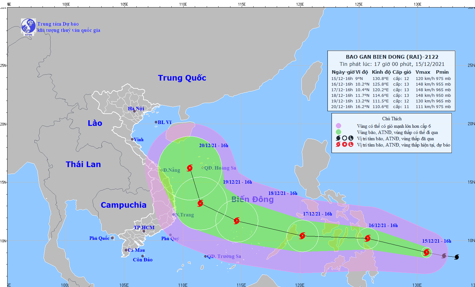 Theo Trung tâm dự báo khí tượng thủy văn Quốc gia, hiện nay (15/12), một cơn bão mạnh đang hoạt động ở phía Đông Phi-líp-pin và có tên quốc tế là RAI.