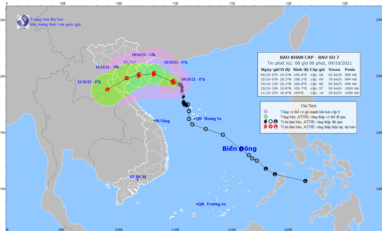 Theo Trung tâm dự báo khí tượng thủy văn Quốc gia, hồi 7 giờ ngày 9/10, vị trí tâm bão ở vào khoảng 19,5 độ Vĩ Bắc; 109,8 độ Kinh Đông, trên khu vực đảo Hải Nam (Trung Quốc). Sức gió mạnh nhất vùng gần tâm bão mạnh cấp 8 (60-75km/giờ), giật cấp 10. Bán kính gió mạnh từ cấp 6, giật từ cấp 8 khoảng 120km tính từ tâm bão.