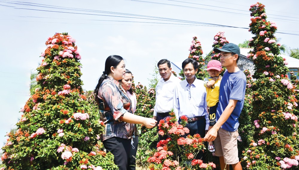 Bà Bùi Thị Hiền (bìa trái), Chủ tịch HĐND tỉnh Kiên Giang và cán bộ Hội Nông dân huyện An Minh tham quan vườn bông trang bonsai của gia đình ông Trần Chí Công.