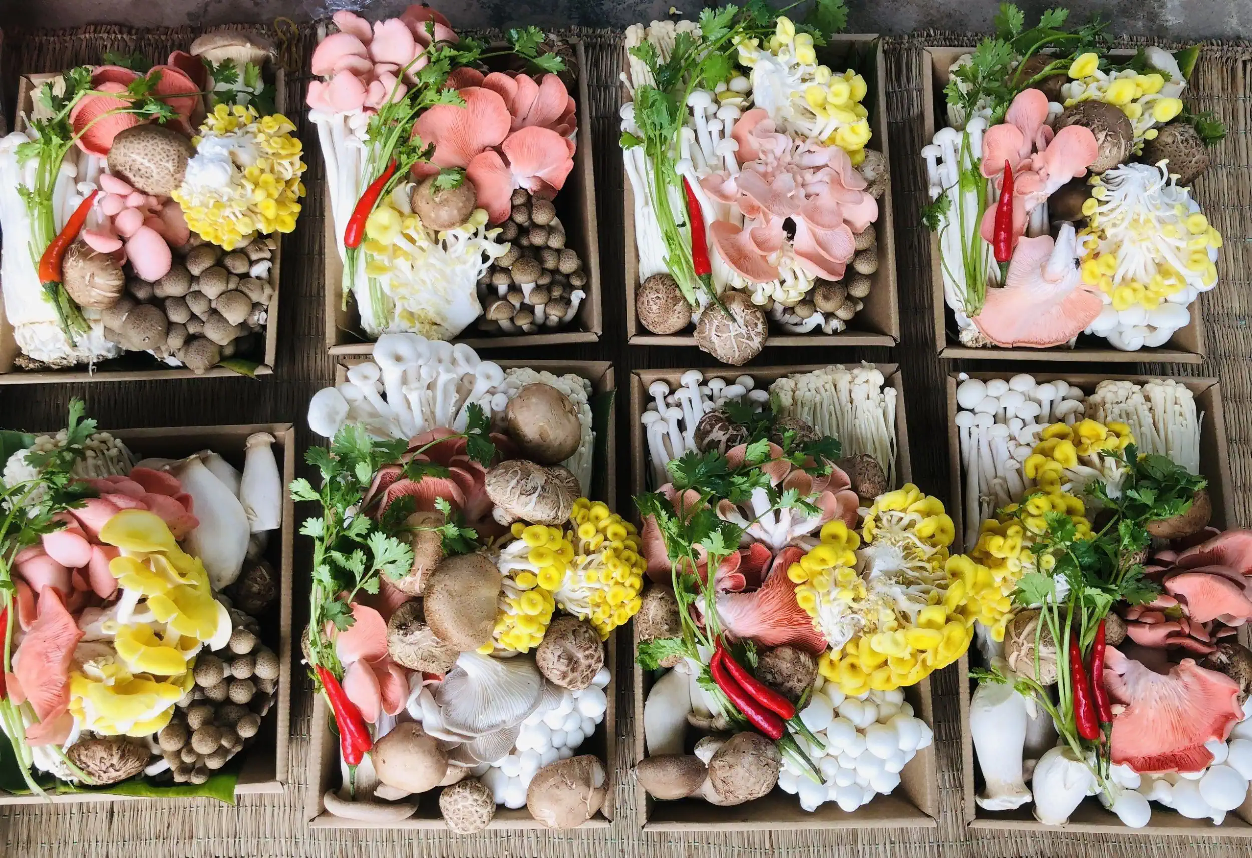 Những combo nấm gần 20 loại do trại trồng hoặc liên kết tiêu thụ được chị Xuân xuất bán thu hút khách hàng.