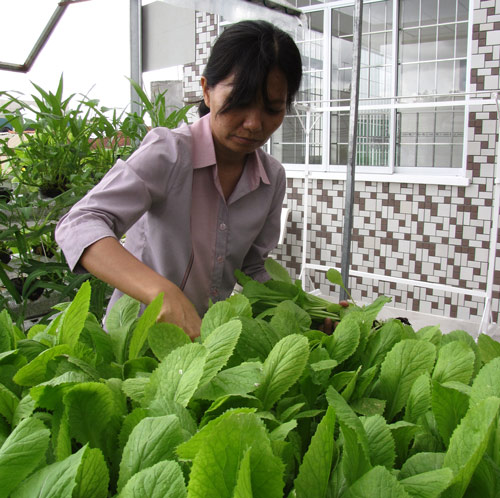 Khoảng sân trước cửa nhà cô Nguyễn Thị Ngọc Dung, ngụ tại khu phố 3, thị trấn Bến Lức, huyện Bến Lức gần nửa năm nay rất bắt mắt và thu hút sự chú ý của nhiều người đi đường bởi giàn rau do cô tự trồng theo quy trình công nghệ cao. Theo cô Dung, trước khi trồng rau cô được chị Nguyễn Thị Hạnh hướng dẫn kỹ các kỹ thuật và thao tác cơ bản. Đến thời điểm này, giàn rau nhà cô gồm nhiều loại từ cải xanh, cải ngọt, rau muống và rau gia vị, tất cả đều phát triển tốt. Nếu biết chọn thời điểm gieo hạt, chịu khó chăm sóc thì với khoảng 10m2 dành cho giàn rau trước sân nhà, gia đình cô có đủ rau rạch để dùng mỗi ngày.
